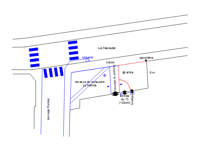 Les lignes noires constituent le plan de cadastre, ainsi à l'échelle : une cote de 8 m est indiquée sur la figure, correspondant à la profondeur de la partie de trottoir à "végétaliser", elle est indiquée par la photo superposée sur le plan de cadastre. Le rond noir dessiné sur le pied de l'arbre et les lignes rouges sont reportés sur les images suivantes.